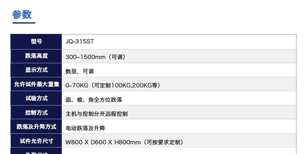 產品型號:JQ-315ST 品牌:劍 喬 用途:動力電池跌落試驗機主要用于評估各類鋰電池及鎳電池等其他一次電池,二次電池,蓄電池單體或電池組自由跌落(例如從臺面頂部)的安全性能。電池以不爆炸不起火為合格。咨詢熱線:13829135130