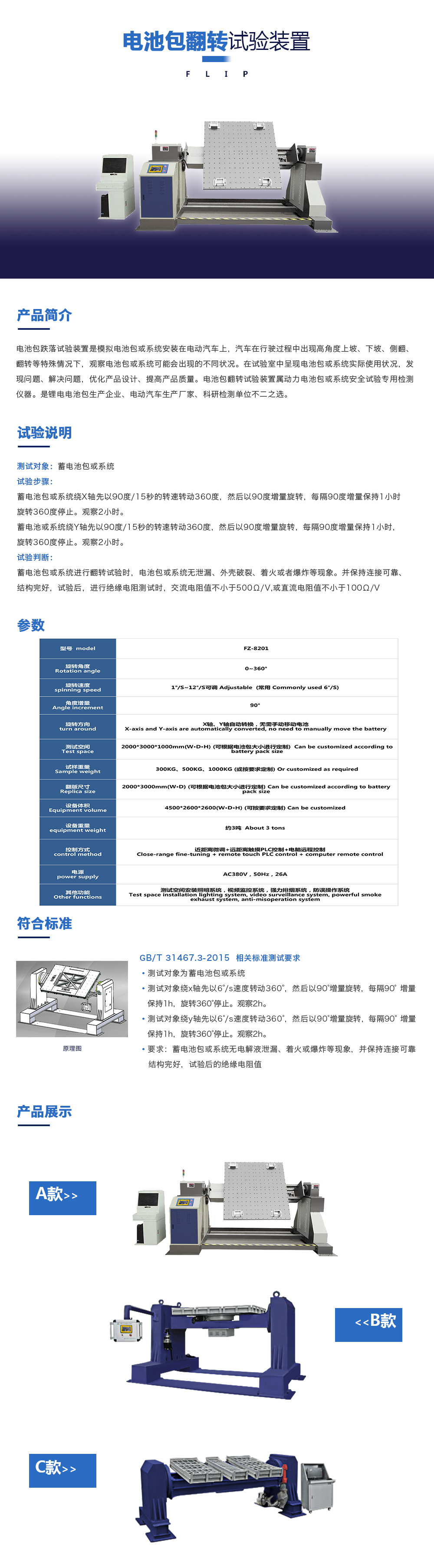 產(chǎn)品型號:JQ-8201 品牌:劍 喬 用途:電池包翻轉(zhuǎn)試驗(yàn)臺是模擬電池包或系統(tǒng)安裝在電動汽車上,汽車在行駛過程中出現(xiàn)高角度上坡、下坡、側(cè)翻、翻轉(zhuǎn)等特殊情況下,觀察電池包或系統(tǒng)可能會出現(xiàn)的不同狀況。在試驗(yàn)室中咨詢熱線:13829135130