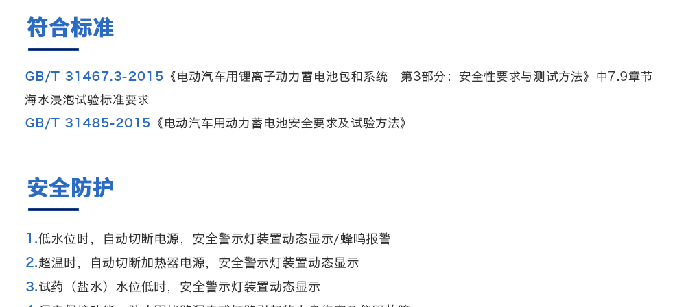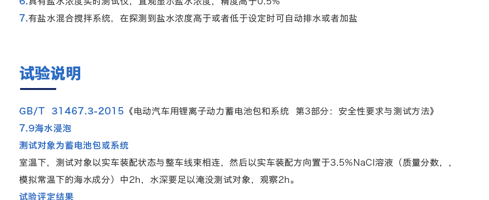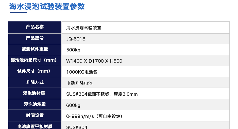 產品型號:JQ-6018 品牌:劍 喬 用途:海水浸泡試驗裝置主要用于電池以實車裝配狀態與整車線束相連然后以實車裝配方向在常溫下的海水成分中浸泡2h(海水為模擬海水成分,濃度為3.5%NaCl溶液)水槽中海水深度要足以淹咨詢熱線:13829135130