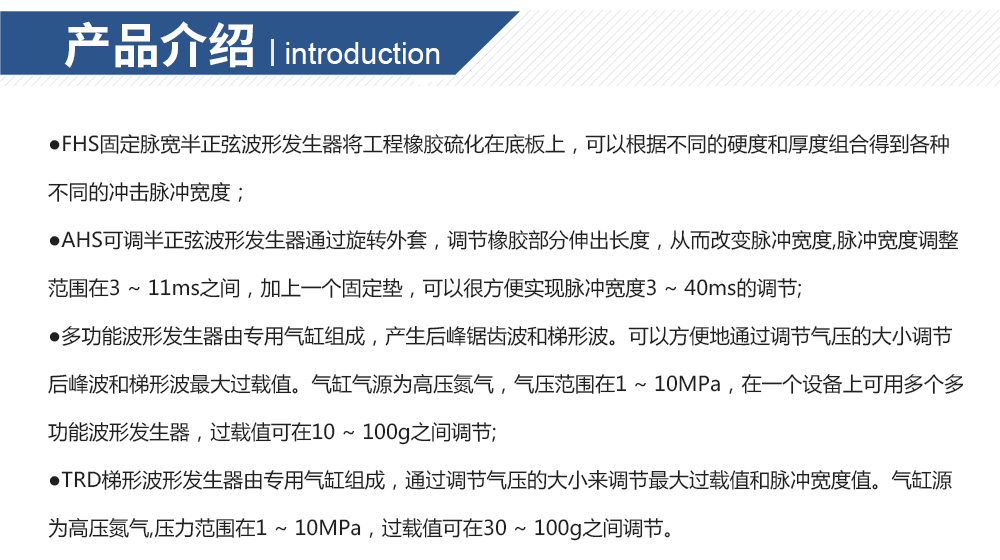 產品型號: 品牌:劍 喬 用途:FHS固定脈寬半正弦波形發(fā)生器將工程橡膠硫化在底板上,可以根據不同的硬度和厚度組合得到各種不同的沖擊脈沖寬度。咨詢熱線:13829135130